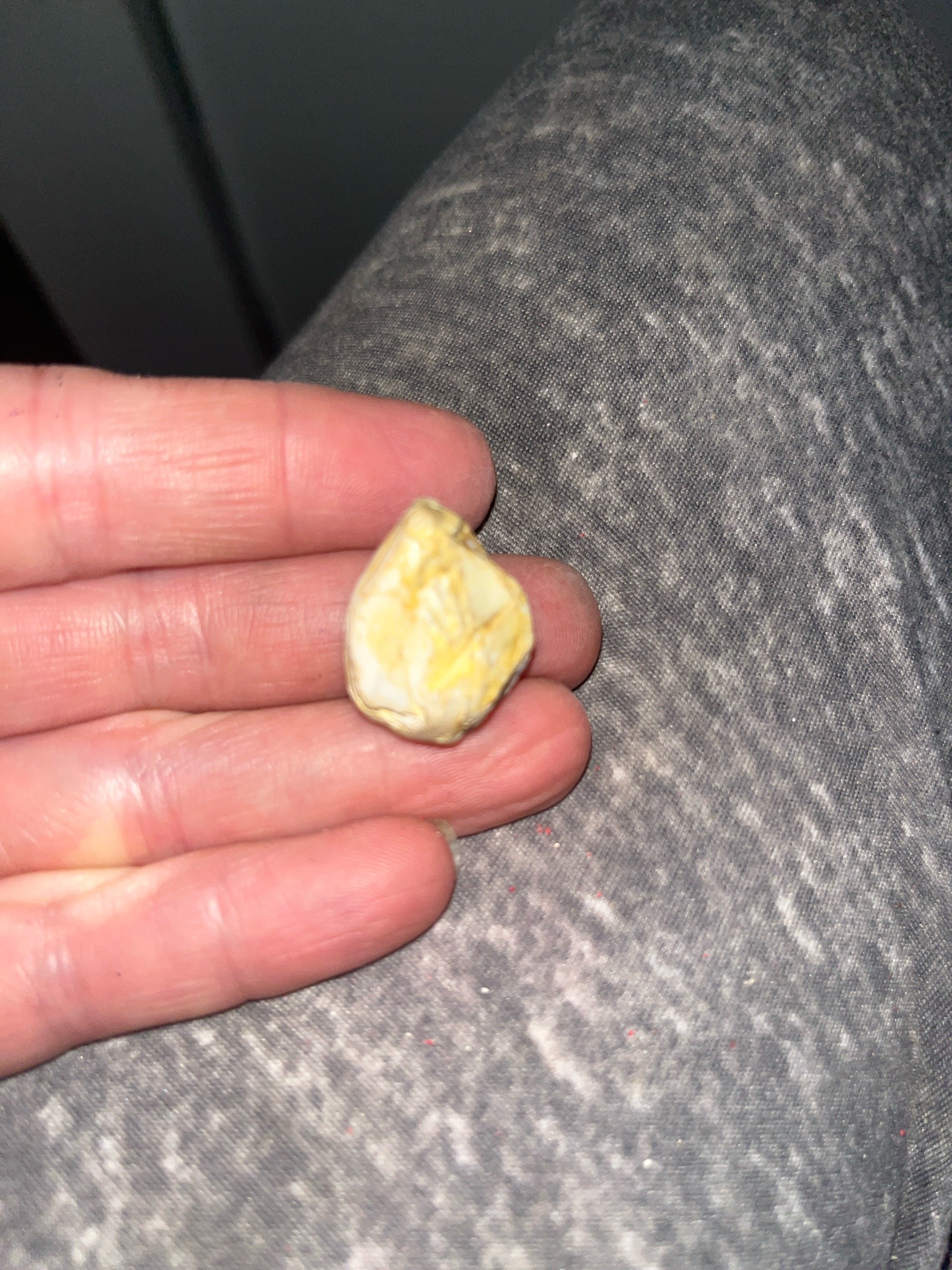 This item is a small, natural gemstone, specifically a variety of jasper or agate, which has been tumbled and polished to achieve a smooth, rounded finish. It measures approximately 15mm to 20mm in length, fitting easily on a fingertip. The stone exhibits a distinct bi-color pattern with creamy white and vibrant mustard-yellow swirls, typical of silicates like mookaite or common yellow jasper. Physically, it is opaque with a waxy to vitreous luster, showcasing the dense, microcrystalline structure of the quartz family. There are no visible maker's marks, as it is a natural mineral product. The surface appears mostly smooth, though a few minor pits and natural surface fractures (fissures) are visible, which are common in tumbled stones where the polishing process cannot reach deep crevices. The craftsmanship involved is mechanical tumbling rather than hand-carving. Based on its appearance, it is a contemporary piece commonly used for pocket stones, healing crystals, or lapidary supplies. The color distribution is organic and asymmetrical, providing a unique aesthetic that varies with every specimen. It shows no significant wear beyond natural inclusions, suggesting it has been kept in a protected environment.