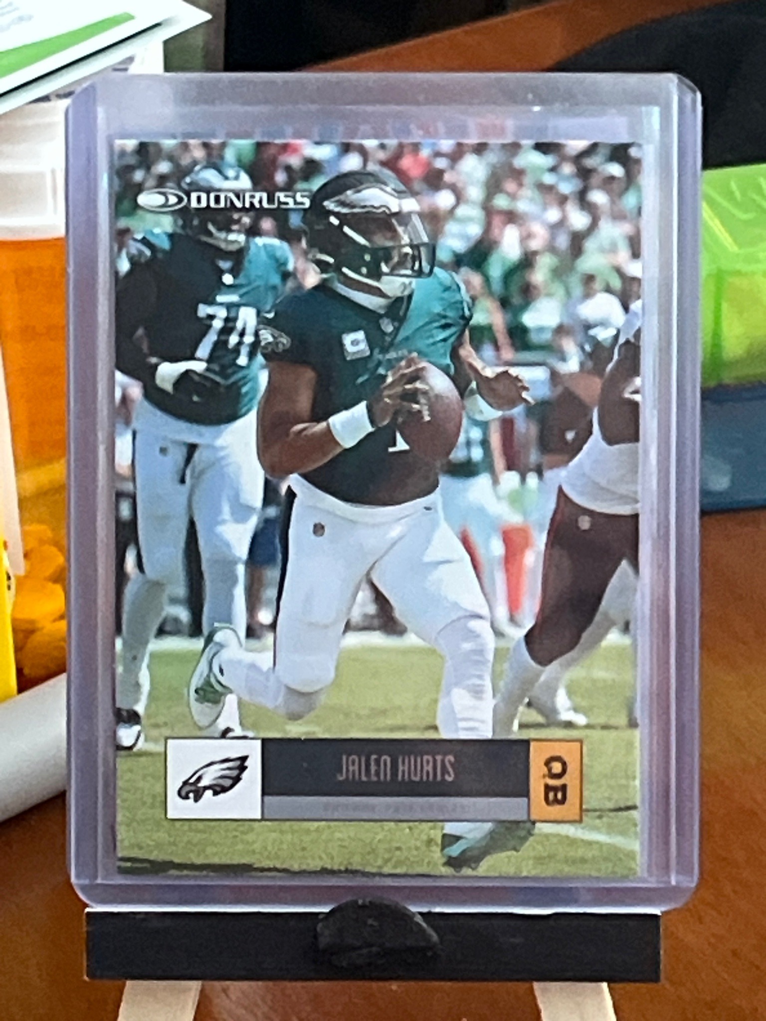 This is a 2022 Donruss brand trading card featuring Philadelphia Eagles quarterback Jalen Hurts. The card standardly measures 2.5 by 3.5 inches and is constructed from light cardboard stock with a glossy finish. The front design displays a modern full-bleed action photograph of Hurts in his green home jersey and white pants, actively scrambling with a football. The Donruss brand logo is visible in the upper left corner. A clean identifier bar at the bottom features the Philadelphia Eagles wing logo on the left, the name 'JALEN HURTS' in the center, and a vertical 'QB' position indicator in gold on the right. The card is currently housed in a clear semi-rigid plastic top-loader for protection. Regarding condition, the centering appears slightly biased towards the left border, and through the plastic, the corners appear sharp without significant whitening. There are no visible surface scratches or creases on the primary image area. This card represents a base-level contemporary sports collectible from a major manufacturer (Panini/Donruss).
