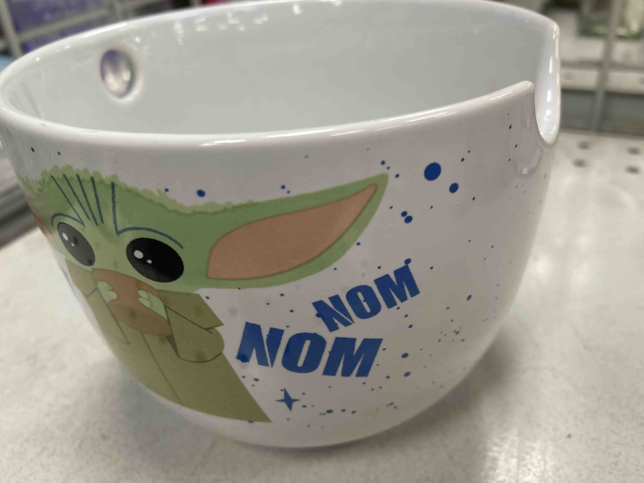 This is a specialized ceramic knitting or crochet yarn bowl featuring a white-glazed exterior with printed graphics of Grogu (popularly known as Baby Yoda) from the Disney+ series, 'The Mandalorian'. The bowl is constructed from heavy, durable stoneware or ceramic with a smooth, bright white gloss finish. Its most prominent functional feature is a deep u-shaped notch on the right side and a circular hole on the left, both designed to feed yarn through to prevent tangling while working. The graphic depicts a stylized illustration of Grogu wearing his signature tan robe, holding a cup or snack, accompanied by blue 'NOM NOM' text and a splatter/star pattern. The bowl's shape is deep and rounded to hold a standard skein or ball of yarn securely. In terms of condition, the piece appears to be in excellent contemporary condition with no visible chips, cracks, or crazing in the glaze. The printing of the character remains vibrant without signs of fading or mechanical wear. This is a mass-produced pop-culture collectible item, likely manufactured within the last 5 years (circa 2020-present) to capitalize on the popularity of the Star Wars franchise. The craftsmanship is consistent with high-quality retail merchandise intended for hobbyists.