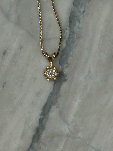 This fine jewelry piece features a single round brilliant cut colorless diamond, approximately 0.20 to 0.30 carats, set within a decorative 14k or 18k yellow gold mounting. The diamond is secured by multiple prongs in a scalloped, flower-shaped buttercup or illusion-style setting, which is designed to enhance the visual diameter of the stone. The pendant is suspended from a classic box-style chain, also crafted in yellow gold, which provides a sturdy and structured aesthetic. The metal displays a bright, high-polish finish with minimal surface scratches, suggesting a well-maintained condition. The construction utilized a tapered bail that allows the pendant to slide freely along the chain. While specific hallmarks are not visible in the image, the craftsmanship suggests a late 20th-century to contemporary manufacturing period. The stone appears to have good clarity and brilliance, reflecting light effectively across its facets. The chain links are tight and uniform, indicating a high-quality machine-made manufacture. There are no signs of heavy wear, link deformation, or prong thinning, though a professional cleaning would brighten the metal's natural luster further. Overall, this is a classic example of bridal or fine fashion jewelry that emphasizes timeless elegance and durability.