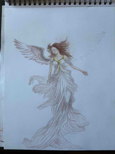 This item is an original figurative illustration of a winged female figure, likely an angel or celestial being, rendered on a page of a spiral-bound sketchbook. The artwork measures approximately 9x12 inches, based on standard sketchbook sizing. It is executed using a combination of graphite, colored pencils, and what appears to be gold metallic ink or paint for the bodice detailing. The central figure is depicted with flowing auburn hair and large, expansive wings; notably, one wing is more fully rendered with grey shading and feathered textures, while the other remains a simple linear outline, indicating an unfinished state. The figure wears a diaphanous, translucent white gown with multiple layers and flowing hems, creating a sense of movement. The bodice is accented with gold-toned trim and a teardrop-shaped focal point. Condition-wise, the paper shows slight rippling and some light smudging typical of pencil work. The piece is a contemporary student or hobbyist-level study, showing varied skill in anatomical proportions and drapery. No visible signature or date is present on the front of the page. The paper is bright white with a slightly textured surface suitable for dry media.