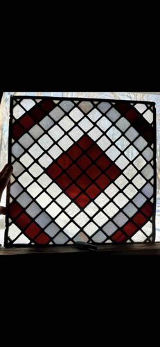 This item is a square architectural stained glass panel, likely a window sash or transom, featuring a geometric lattice pattern. The design is composed of small, diagonally-oriented squares (quarries) in varying shades of red and translucent frosted or white glass, arranged to create a central diamond motif framed by a corresponding red border. The construction utilizes traditional lead cames to join the individual glass pieces, with a thicker black lead or iron perimeter frame for structural integrity. The glass appears to have an undulating, handmade texture characteristic of rolled or cataract glass, which diffuses light softly. The lead work shows a consistent dark patina, suggesting significant age, likely dating to the late 19th or early 20th century (Victorian or Edwardian era). While the overall structure appears stable, some minor irregularities in the leading and slight bowing are visible, typical for salvaged architectural glass of this period. The craftsmanship is highly disciplined, with careful attention paid to the alignment of the diagonal grid. There are no visible maker's marks or signatures evident in the provided view, which is common for residential architectural components of this style.