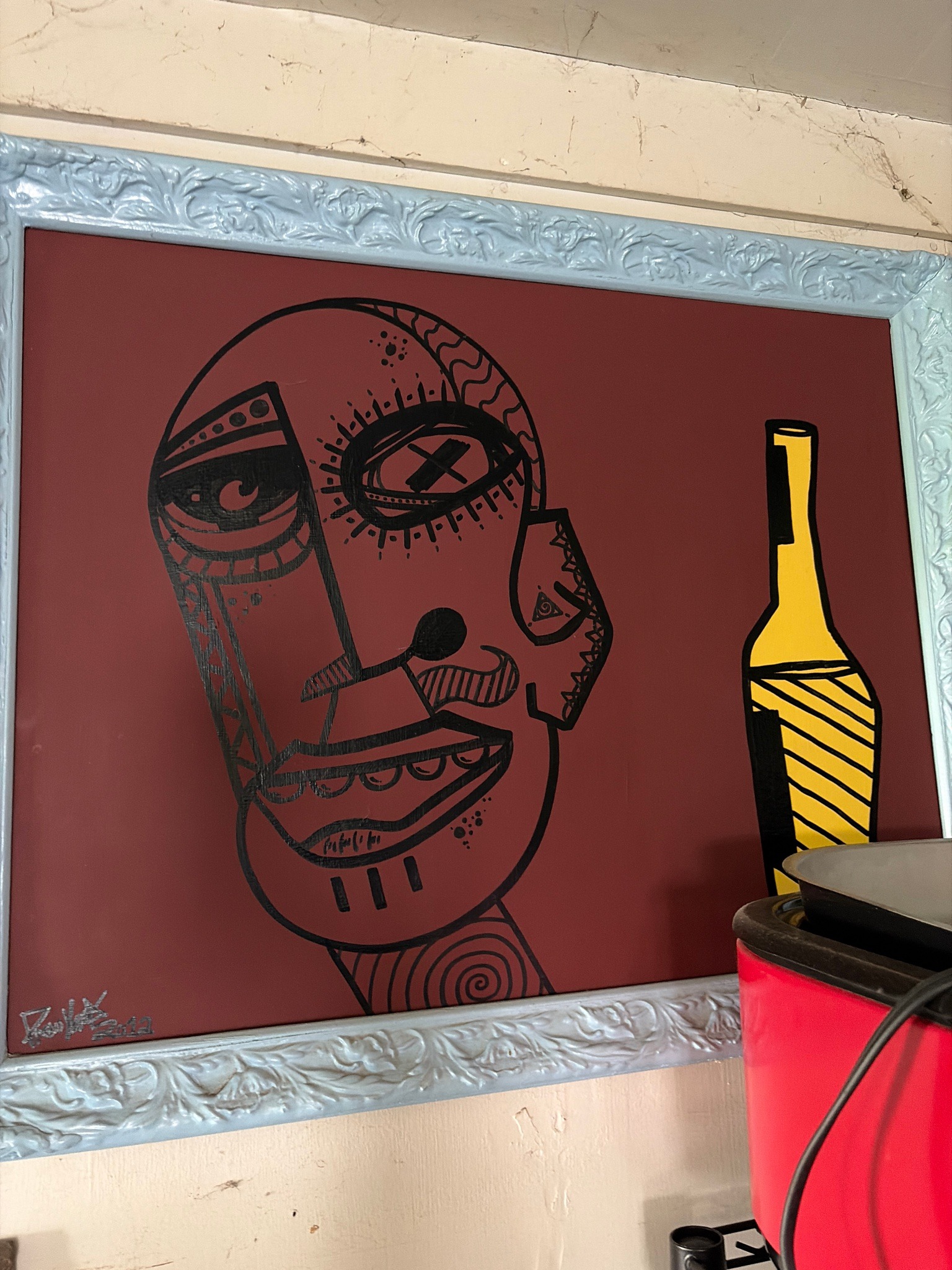 This contemporary artwork features a bold, neo-expressionist stylized portrait set against a deep burgundy or maroon background. The central figure is an abstracted face rendered with thick black outlines and intricate, doodle-like patterns including geometric shapes, cross-hatching, and spiral motifs. To the right of the face is a minimalist yellow and black bottle, providing a high-contrast visual balance. The piece is signed and dated '2012' in the lower left corner in silver or white ink. The medium appears to be acrylic or oil paint on a flat substrate, likely canvas or board. The work is housed in a decorative, ornate rococo-style wooden frame that has been painted a light sky-blue color. This juxtaposition of a modern, graphic art style with a traditional, repurposed frame suggests a 'shabby chic' or eclectic aesthetic. Regarding condition, the paint surface appears stable with some minor surface dust. The frame shows slight wear consistent with age, including small scuffs and paint chips that reveal the underlying texture. The craftsmanship exhibits a strong command of line work and graphic composition popular in urban and street-influenced gallery art from the early 2010s.
