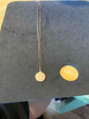 This item is a minimalist style necklace consisting of a circular disc pendant suspended from a fine curb link chain. The pendant is a flat, polished gold-tone metal disc with a smooth, unadorned surface, suggesting it may be intended for personalized engraving. The chain is constructed from small, uniform interlocking metal links, appearing to be crafted from either gold-plated base metal or gold-filled material rather than solid high-karat gold, given the visible sheen and weightiness relative to its size. The necklace measures approximately 16 to 18 inches in total length. Regarding condition, the metal displays minor surface micro-scratching and light tarnish consistent with modern wear and use, particularly near the jump ring attachment. The clasp mechanism at the top appears to be a standard spring ring or lobster claw. There are no visible hallmark stamps or maker's marks in the current view, which is common for contemporary mass-produced jewelry. The overall craftsmanship is simple and linear, representing a late 20th to early 21st-century aesthetic often found in 'fast fashion' or accessible bridge jewelry collections.