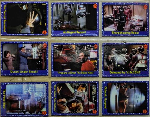 This is a collection of nine 1979 Topps trading cards based on the Walt Disney Productions science fiction film 'The Black Hole'. The cards are standard 2.5 by 3.5 inches, constructed from semi-glossy cardstock. The aesthetic is characterized by a distinctive blue border speckled with white dots to simulate a starfield, framing various cinematic stills from the movie. Each card includes a yellow-captioned title at the bottom such as 'The Secret Revealed', 'An Urgent Report!', and 'Defeated by V.I.N.CENT.'. A small orange robot icon is visible in the corner of several cards, acting as a branding element for the series. The copyright '© 1979 Walt Disney Productions' is printed in small text on the front of each card. These cards are currently housed in a transparent plastic nine-pocket collector's sleeve. Based on the visual evidence, the cards show signs of aging including slight corner softening and minor surface wear typical of vintage paper collectibles. Condition appears to be mid-grade; while the colors remain vibrant, the centering varies between individual cards, which is common for Topps production from this era. No major creases or tears are immediately visible through the protective sleeve.