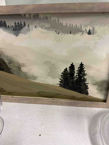 This item is a contemporary landscape artwork featuring a minimalist, atmospheric mountain scene. The piece is rendered in a limited color palette of muted sage green, charcoal grey, and soft beige, creating a misty or foggy alpine effect. The composition utilizes stylized, silhouetted evergreen trees against layered, sloping terrain. In terms of construction, the artwork appears to be a digital print or a high-quality lithograph on paper, characterized by clean color blocking and sharp edges rather than visible impasto or traditional brushstrokes. It is housed in a simple, flat-profile wooden frame with a weathered or rustic grey finish that complements the cool tones of the art. The frame shows minor surface abrasions consistent with light handling. No signature or maker's mark is visible in the provided image, suggesting it may be a mass-produced decorative home accent likely from the 21st century. The craftsmanship is clean and functional, aimed at modern interior design aesthetics.