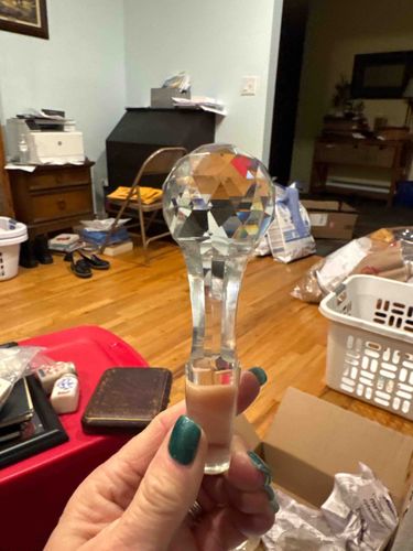 This item is a vintage-style decanter topper or stopper, likely crafted from high-lead crystal or exceptionally clear glass. The design features a large, spherical finial with multiple geometric triangular facets that catch the light, creating a sparkling refractive effect. The finial is mounted atop a tapered, multi-sided pedestal neck which transitions into a ground-glass shank. The shank is finished with a frosted matte appearance, which is a functional detail designed to create an airtight seal when paired with a matching decanter neck. In terms of dimensions, the piece appears to be approximately 5 to 6 inches in total length. The clarity of the material and the sharpness of the facets suggest high-quality craftsmanship, possibly in the style of well-known glassmakers like Waterford or Baccarat, though no specific acid-etched maker's mark is visible in the provided image. The condition appears to be very good with no obvious chips to the delicate facet edges or the bottom of the ground plug. The style is classic and formal, likely dating from the mid-20th century to the late vintage era. The prismatic fire seen within the facets indicates a high refractive index consistent with lead crystal.