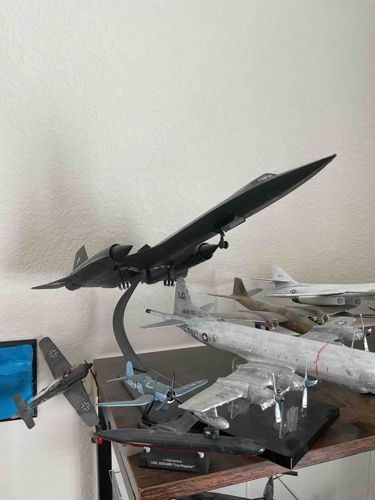 This is a detailed scale replica of a Lockheed SR-71 'Blackbird' long-range, high-altitude strategic reconnaissance aircraft. The model features the iconic sleek, delta-wing design and is finished in a uniform matte black color intended to mimic the radar-absorbent paint of the actual aircraft. It appears to be constructed from either high-density resin or injection-molded plastic. The model is presented in an inflight configuration, dramatically mounted on a black curved 'S-shaped' display stand that secures to the underside of the fuselage. Notable features include the distinctive dual engine nacelles positioned mid-wing and the sharp, chined fuselage. There are subtle visible markings on the vertical stabilizers, likely representing specific squadron tail codes. In terms of condition, the model shows some minor surface dust and light handling wear, but the structure remains intact without visible breaks in the narrow nose or tail sections. Based on the craftsmanship and accompanying collection of models (which include a P-3 Orion and an F4U Corsair), this is likely a contemporary enthusiast's display piece, possibly from makers like Executive Series or PacMin, dating from the late 20th to early 21st century. The craftsmanship is of high quality, emphasizing aerodynamic accuracy and proportions.