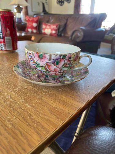 Famille Rose Medallion Porcelain Teacup and Saucer