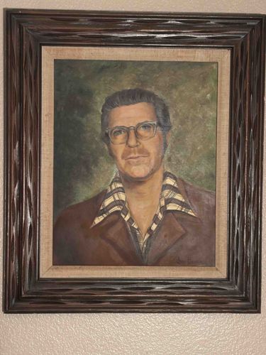 This is an original oil painting on canvas, likely dating from the late 1960s to the 1970s. The artwork features a realistic torso-up portrait of a middle-aged male subject with dark hair, sideburns, and heavy-rimmed spectacles. He is depicted wearing a wide-collared plaid shirt beneath a brown jacket, a style highly characteristic of the mid-20th century. The background is rendered in a mottled, Impressionistic style with greens and browns, providing a neutral depth that highlights the subject. The brushwork appears deliberate with blended transitions on the facial features. The piece is housed in a contemporary 'wavy' or 'hand-carved' style wood frame with a dark mahogany-toned finish, separated from the canvas by a light tan linen liner. There is an indiscernible signature in the lower right corner. The condition appears fair to good; the canvas shows some minor age-related darkening, though no significant paint loss or cracking is visible from the primary view. The frame exhibits minor surface dust and possible slight scuffing consistent with age. This piece serves as a classic example of mid-century amateur or regional portraiture, showcasing personal identity through the fashion and accessories of the era.