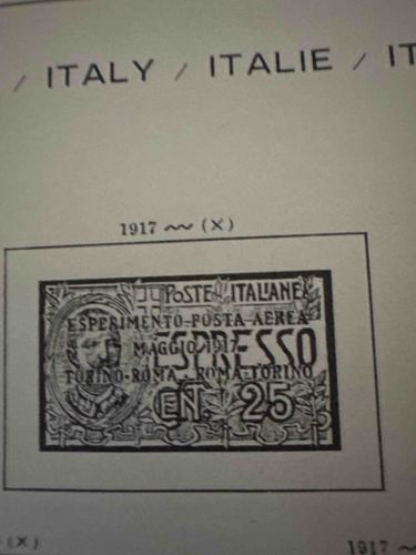 This item is an image or illustration of the 1917 Italian 'Esperimento Posta Aerea' postage stamp, which holds the distinction of being the world's first official airmail stamp. The physical item depicted is a rectangular adhesive stamp printed on paper, featuring a monochrome black ink design. The central motif includes a portrait of King Victor Emmanuel III within an oval frame, set against a background of decorative filigree and laurel leaves. Notably, the stamp is a 25-centesimi (CT. 25) 'Espresso' (Special Delivery) stamp overprinted with the text: 'ESPERIMENTO POSTA AEREA / MAGGIO 1917 / TORINO-ROMA ROMA-TORINO'. This overprint commemorates the experimental flight between Turin and Rome. The construction utilizes fine-line engraving typical of early 20th-century philatelic production. As this is an image contained within a philatelic album or catalog page (indicated by the 'ITALY / ITALIE' and '1917' text above it), the 'condition' of the stamp itself appears to be a clear, high-contrast reproduction. The design reflects the transitional period of postal history where existing stock was repurposed for new air transport technology. The craftsmanship is highly detailed, featuring a complex border that served as a security measure against counterfeiting, a common practice for higher-value express services during the World War I era.