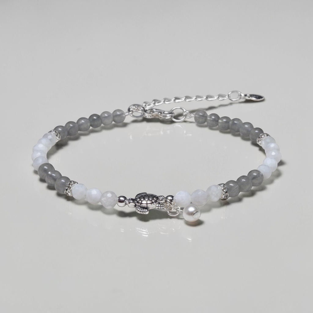 This contemporary beaded bracelet features a monochromatic color palette, alternating between smooth grey-toned semi-precious stones and faceted translucent white moonstone or quartz beads. The design is centered around a silver-toned sea turtle charm with detailed shell texturing, accompanied by a single dangling white pearl charm for added visual interest. The construction utilizes sterling silver components, including decorative filigree spacer beads that separate the color blocks, and tiny spherical metal beads flanking the central charm. The bracelet is secured with a lobster claw clasp and a silver extender chain, allowing for adjustable sizing and ending in a small hallmark tag. The stones appear to be approximately 4mm in size, demonstrating uniform quality and a high-polish finish. As a new item, there are no visible signs of wear, patina, or damage; the metal elements are bright and reflective. The craftsmanship indicates a commercial jewelry design, blending natural materials with symbolic marine motifs, suitable for casual or thematic wear. The overall aesthetics suggest a modern beach-style or bohemian-inspired accessory crafted within the last decade.