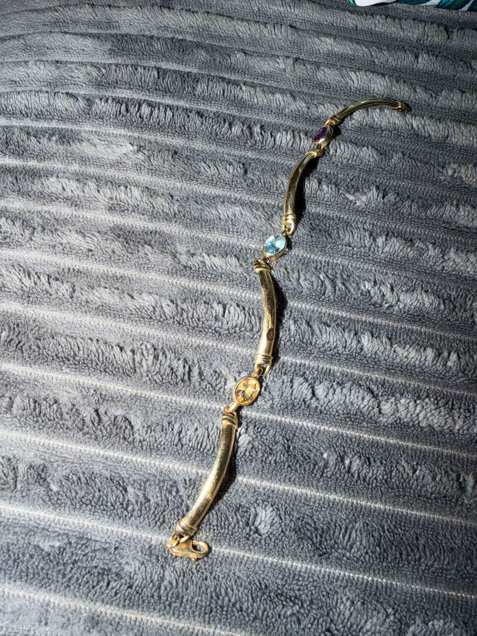 This is a contemporary-style link bracelet featuring elongated, curved high-polish gold bars interspersed with bezel-set oval gemstones. The bracelet showcases a variety of colored stones, including a pale blue topaz, a yellow citrine or quartz, and a deep purple amethyst, each set in an open-back bezel to allow light through. The metal appears to be yellow gold, likely 10k or 14k based on common commercial jewelry standards of the late 20th century. The construction utilizes hinged bar links with decorative ribbed end-caps, terminating in a standard lobster claw clasp for security. Each curved section is approximately 25-30mm in length, giving the piece a structured yet fluid movement on the wrist. Condition-wise, the piece shows visible surface abrasions and fine scratches consistent with regular wear, particularly on the gold bar surfaces. There is some minor grime accumulation around the gemstone settings which would benefit from professional cleaning. No significant chips are visible on the stones from this angle, though the facet edges on the yellow stone show very slight wear. This piece likely dates from the 1990s to early 2000s, a period where 'mother's bracelets' or multi-colored semi-precious bar link designs were highly popular.