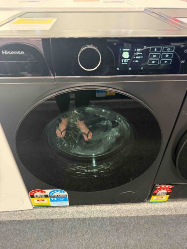 This is a modern Hisense front-load washing machine, likely the 5S Series or a similar high-capacity model, finished in a contemporary dark titanium or graphite steel color. The unit features a large, oversized black-tinted tempered glass door with a chrome-look outer bezel, which gives it a premium aesthetic. The upper control panel consists of a digital display on the right showing cycle details like 'Cotton', '20°', and '1200' RPM, alongside a sleek central rotary dial with an illuminated ring for program selection. The Hisense logo is prominently displayed on the pull-out detergent drawer to the left. At the bottom of the unit, several official labels are visible, including a red Energy Rating sticker and a blue Water Rating sticker (indicating 4.5 stars and 72 liters respectively), which are specific to the Australian/New Zealand market. The machine appears to be a new retail unit based on its condition and the presence of showroom energy stickers. Its construction involves a metallic exterior shell, plastic control interfaces, and a standard stainless steel internal drum visible through the glass. No significant wear or damage is noted, though the high-gloss black surfaces are highly reflective, showing a person or observer in the glass. The style is strictly contemporary, representing appliance design from the early 2020s, focusing on smart technology and energy efficiency.