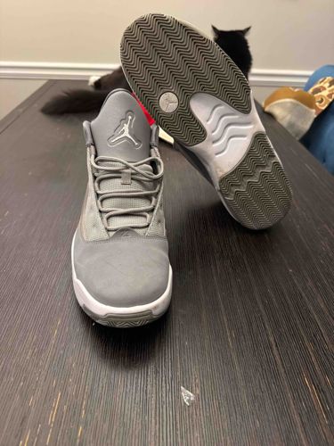 This pair of Jordan Max Aura basketball shoes is presented in a monochromatic 'Cool Grey' and white colorway. The design is a hybrid silhouette that draws heavy inspiration from the Air Jordan 10 and Air Jordan 11. The upper features a combination of genuine and synthetic leather along with textile materials for durability and breathability. Notable branding includes a prominent white Jumpman logo embroidered on the tongue and another logo situated on the outsole traction pod. The lacing system utilizes rounded grey cords through a webbed eyelet structure. Condition-wise, the shoes show signs of light wear, including minor creasing on the toe box of the nubuck-style material and slight scuffing on the white foam midsole. The outsoles exhibit moderate surface dirt and light smoothing of the herringbone traction pattern, though the rubber remains intact. The construction quality is typical of Nike's performance lifestyle line, featuring a visible Air Max unit in the heel for cushioning. Based on the style, these likely date from the late 2010s to early 2020s manufacturing period. The lining appears to be a matching grey mesh, and the overall structural integrity of the collar and heel counter remains firm.