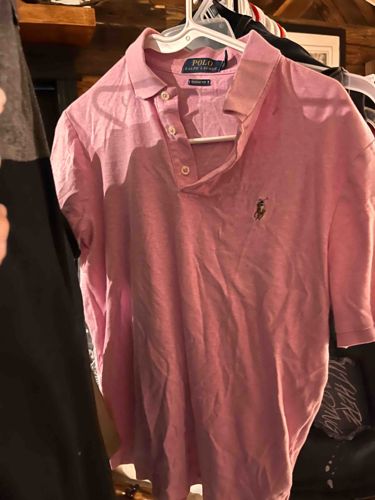 This is a men's short-sleeved polo shirt by the brand Polo Ralph Lauren, featuring a light pink or coral hue. The garment is constructed from a traditional cotton piqué knit fabric, characterized by its textured, breathable weave. It features a ribbed flat-knit collar and a three-button placket with translucent or pearlized buttons. A defining characteristic is the embroidered multi-colored 'Pony' logo on the left chest, a signature mark of the brand. The interior neckline contains a blue woven brand label with gold lettering and a secondary 'Classic Fit' size tag. Regarding condition, the shirt appears heavily wrinkled, suggesting it has been stored without pressing. There is visible discoloration or possible staining on the left collar point and shoulder area, which may affect its secondary market value. The overall construction highlights the brand's standard mass-market quality, with reinforced stitching at the placket and side vents at the hem. This style is a contemporary staple of the preppy or Americana aesthetic, likely produced within the last 5 to 10 years.