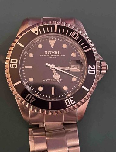 This is a stainless steel wrist watch designed with a heavy influence from the iconic Rolex Submariner diver style. The timepiece features a brushed steel case and a three-link Oyster-style bracelet. The black dial is marked with the unusual brand name 'ROYAL' and the text 'RAINBOW TIME OF PERSON DATING' and 'WATER RESIST'. It utilizes 'Mercedes' style hands, round and rectangular luminescent hour markers, and a date window positioned at 3 o'clock with a magnification 'cyclops' lens on the glass. The watch includes a unidirectional rotating black bezel with silver Arabic numerals for timing decompression or elapsed intervals. In terms of condition, there are visible surface scratches and 'desk diving' marks on the bracelet links and the lugs, suggesting regular wear. The edge of the crystal appears to have minor chips or accumulated debris near the 7 and 9 o'clock marks. Based on the typography and specific 'word salad' text common in budget imports, this piece represents a contemporary fashion-grade homage watch, likely manufactured in the late 20th or early 21st century. The level of finishing on the crown and bezel suggests basic mass-production quality rather than high-end horology.