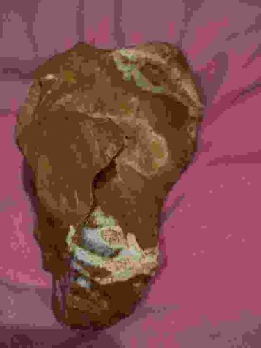 This specimen is a naturally occurring rock nodule, likely composed of chert, flint, or a jasper-agate conglomerate. It exhibits a predominantly earthy brown to dark ochre primary color with a matte, slightly textured surface. A defining characteristic of this piece is the visible internal banding and crystalline structures revealed through fractures and weathering. These areas display light green, cream, and grayish-white translucent hues, suggesting a siliceous or chalcedony-rich mineral composition. The overall shape is irregular and organic, with an asymmetrical silhouette that narrows toward one end. The surface shows significant natural weathering, including pitted areas and uneven edges, which contribute to its rustic aesthetic. There are no visible signs of human craftsmanship, such as tool marks or polished faces, indicating it is an unworked raw mineral specimen. The condition is consistent with an object found in situ, featuring a heavy patina and minor inclusions of localized mineral deposits. Such nodules are typically associated with sedimentary rock formations and can vary greatly in age, often dating back millions of years. Its value as a geological specimen lies in the interesting contrast between the dark outer rind and the colorful mineralized interior visible through natural breaks.