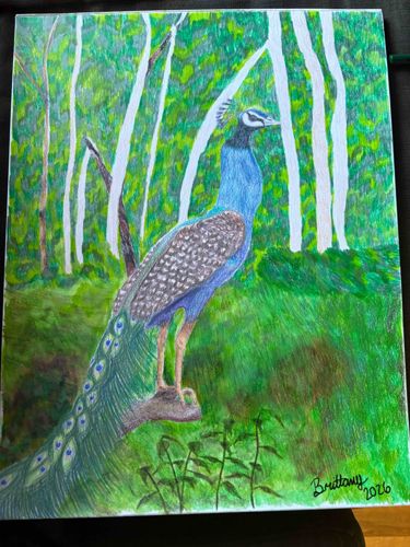 This original work of art depicts a male peacock perched on a branch within a stylized forest setting. The medium appears to be colored pencil or wax crayon on a white paper surface, executed with dense, expressive vertical and hatched strokes. The bird is rendered in vibrant shades of cobalt and cerulean blue with a textured brown and tan wing, trailing a long green tail feathered with hallmark 'eyes'. The background consists of lime and forest green foliage punctuated by white vertical trunks, possibly birch trees, which provide a stark tonal contrast. A notable feature is the signature in the lower right corner, reading 'Brittany 2016' in black ink, establishing the piece's provenance as a 21st-century contemporary work. The condition shows slight undulations in the paper substrate, common for amateur or hobbyist works on light cardstock, but the pigment remains bright. The craftsmanship displays a dedicated layering of color to build depth, particularly in the grass and the plumage of the bird. There are no visible signs of foxing or light-induced fading. As a piece of outsider or student art, it demonstrates a bold use of color and a naive yet charming perspective on nature and wildlife illustration.