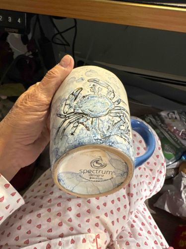 This is a contemporary ceramic mug featuring a coastal blue crab motif, manufactured by Spectrum Designz. The vessel exhibits a cylindrical profile with a slight taper toward the base and a prominent, glossy blue-glazed handle. The exterior body displays a matte, pale cream or off-white background finish, textured with subtle raised relief bubbles to simulate an underwater environment. The central graphic is a detailed sketch-style blue crab, rendered in dark blue and black line work with blue sponged accents. The base of the mug is unglazed ceramic, showing a slight beige-brown discoloration consistent with use. It is clearly marked with the 'spectrum designz' logo and a copyright date of 2019. The construction is mass-produced stoneware or earthenware, intended for functional domestic use. Condition appears good with no visible chips or cracks, though some light staining is present on the bottom foot ring. This modern piece reflects a nautical or maritime aesthetic popular in contemporary kitchenware and gift items from the late 2010s.