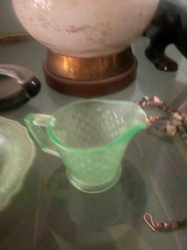 This item is a vintage glass creamer produced in the popular 'Miss America' pattern, which was manufactured by the Hocking Glass Company between approximately 1935 and 1938. The piece is crafted from green transparent glass, a color variant commonly referred to by collectors as 'Depression Glass.' Physically, the creamer features a flared, wide mouth with a prominent pouring spout and a geometric, squared handle typical of the Art Deco influence during the era. The exterior body is decorated with the signature diamond point or 'hobnail' texture that defines the Miss America pattern, which creates a highly refractive surface. The glass has a subtle glow characteristic of uranium glass, though this would need to be confirmed with a UV light. The condition appears fair to good; there is a noticeable internal cloudiness or mineral film, often called 'sickness' in glass collecting, which suggests repeated use or exposure to hard water. There are no major chips visible in the low-resolution image, but the rim and base should be inspected for micro-nicks which are common in this pattern due to the sharp edges of the diamond points. The piece stands roughly 3 to 4 inches tall and represents a classic example of American mass-produced tableware from the Great Depression era.