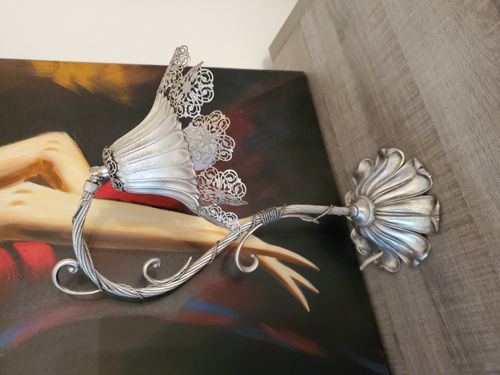 This item is a decorative wall-mounted lighting fixture, specifically a single-arm sconce, featuring an ornate Art Nouveau or Victorian-revival aesthetic. The piece is constructed from a silver-toned metal, likely silver-plated brass, white metal, or pewter. It consists of a flared, fluted circular wall mounting plate with petal-like scalloping. The arm is uniquely designed with a twisted-wire or 'cable' pattern that curves elegantly upward, terminating in a bell-shaped shade holder. The most striking element is the socket cup, which features a fluted base transitioning into intricate laser-cut or hand-stamped filigree lace-work along the upper rim, resembling open floral petals. The finish displays a heavy aged patina with significant oxidation and darkening in the recessed areas of the filigree and twisted wire, which highlights the textural details. No visible maker’s marks are apparent in the provided view, but the craftsmanship suggests mid-20th-century production. The condition appears fair, showing consistent surface wear, some slight bending in the delicate filigree edges, and visible wiring at the base which suggests it may require professional rewiring for modern safety standards.