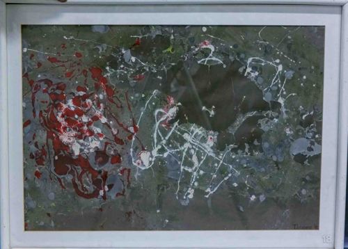 This is an original abstract expressionist Mixed Media painting on paper or board, housed in a simple white wooden frame under glazing. The artwork features a complex composition of 'drip' and 'splatter' techniques, heavily influenced by the Action Painting style popularized by mid-century artists like Jackson Pollock. The palette is dominated by an earthy, muted olive-green and grey background, punctuated by high-contrast splashes of vibrant crimson red and stark white. The red pigment shows varying levels of opacity, suggesting a heavy application of paint, while the white drips create a web-like linear pattern across the center and right side of the composition. A notable dark, almost black, void-like shape anchors the upper right quadrant. Upon close inspection, the lower right corner features a signature and date, appearing to read 'T. Lewis 91', indicating the piece was likely created in 1991. The craftsmanship demonstrates a spontaneous energy with controlled chaos in the layering. The condition appears stable within the frame, showing no immediate signs of moisture damage, though the white frame exhibits minor scuffs and a small numbered sticker '18' in the bottom right corner, suggesting a prior auction or inventory history. The style is characteristic of late 20th-century contemporary abstraction.