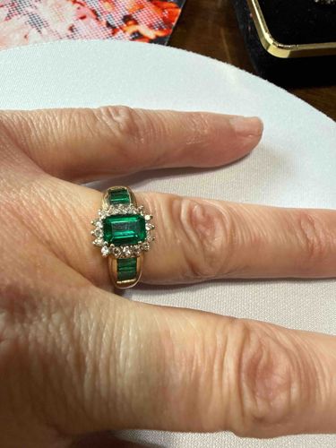 This is a fine jewelry ring featuring a central emerald-cut green gemstone, likely a natural or lab-created emerald, measuring approximately 6x4mm. The center stone is showcased in a classic halo setting comprised of approximately ten small round brilliant-cut diamonds or white accent stones. The ring is constructed from polished yellow gold, likely 10k or 14k based on common commercial jewelry standards. A notable design feature is the presence of three rectangular baguette-cut green stones channel-set into each shoulder of the band, complementing the center stone's color. The emerald-cut center stone exhibits a vibrant, deep green saturation with visible internal characteristics, which are common in natural emeralds. The craftsmanship suggests a late 20th-century or contemporary style, often referred to as a cocktail or anniversary ring. Condition-wise, the stones appear securely set, though the gold band shows minor surface scratches and evidence of wear consistent with regular use. There are no visible maker's marks or hallmarks from this angle, but the overall symmetry and setting style indicate professional manufacturing.
