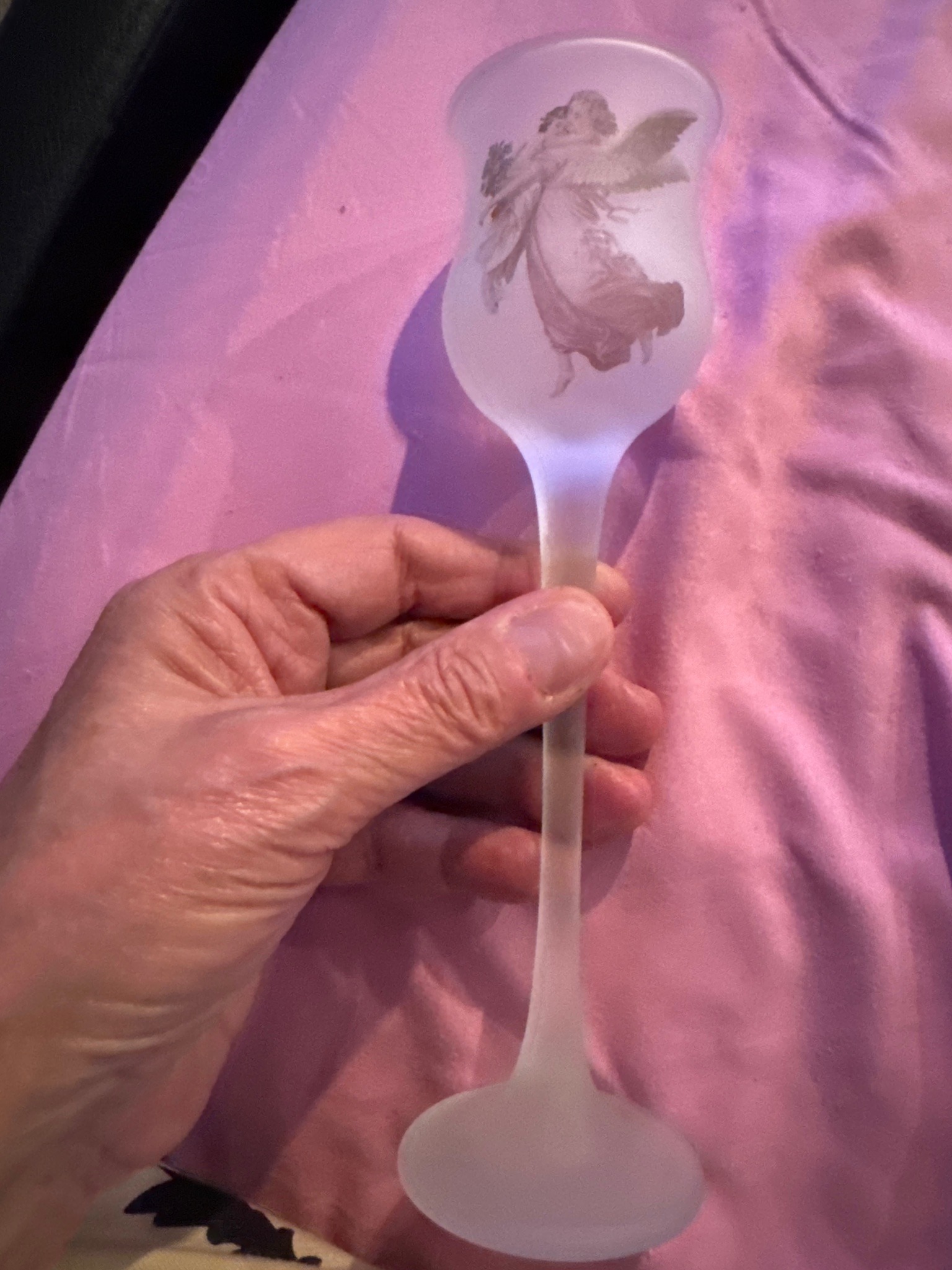 Frosted Satin Glass Stemware with Angel Etching