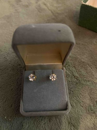 This pair of stud earrings features clear, round brilliant-cut stones set in a yellow-toned metal mount, likely gold or gold-plated. Each earring appears to be held by a traditional multi-prong setting (possibly six prongs) to maximize light entry and brilliance. The stones exhibit a colorless appearance, which could indicate diamonds, white sapphire, or cubic zirconia. They are presented in a grey or taupe-colored velvet-textured clamshell jewelry box with a cream-colored satin-lined interior lid and a matching grey slotted velvet pad for secure placement. The box shows minor signs of age and handled wear, including a small dark spot on the outer top surface. While the exact metal purity and stone identity cannot be confirmed without testing for carats or refractive index, the classic design suggests a mid-to-late 20th-century style. The prong work appears symmetrical, indicating standard commercial craftsmanship. The size of the studs appears to be approximately 0.25 to 0.50 carats each, suitable for daily wear or formal occasions. No visible hallmarks or maker's marks are discernible from the image resolution.
