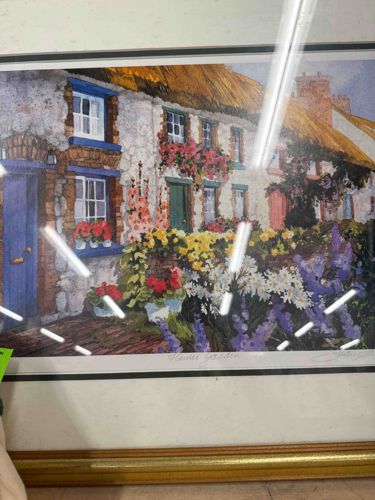 This is a framed art print titled 'Flower Garden,' featuring a charming watercolor landscape of a row of traditional thatched-roof cottages adorned with prolific floral arrangements. The print displays a vibrant palette including purple lavender-like flowers in the foreground, yellow and white blooms along the garden wall, and red accents in window boxes. The cottages are characterized by white-washed stone walls, a prominent bright blue door on the far left, and a mixture of green and pink doors further down the row. The straw thatch is rendered in warm golden tones. Based on the visible text in the bottom margin, the piece is titled 'Flower Garden' in cursive script and includes a printed signature on the right, which matches the style of artist Shirley Felts, known for her botanical and cottage-themed watercolor works. The print is housed behind glass in a multi-layered presentation: it features a wide white mat with a thin black inner border, all set within a gold-toned metallic or wood frame. The visible portion of the frame shows a classic rounded profile with some minor surface dust and light reflective glare. The condition appears fair to good commercially; while no major tears or fading are immediately obvious under the high-glare lighting, the matting shows slight discoloration consistent with age and exposure to light. This style of decorative art is typical of late 20th-century home decor (circa 1980s-1990s).