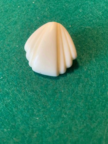 This is a vintage decorative button fashioned in the shape of a stylized scallop shell. The item features a domed, three-dimensional construction with a prominent central ridge flanked by deep vertical fluting or grooves on either side, mimicking the natural architecture of a seashell. It is monochromatic with a cream-white or off-white hue and possesses a soft, satin-to-glossy finish that is characteristic of early plastics. The material appears to be a molded thermoset plastic, likely Bakelite, Celluloid, or Lucite, though the lack of visible grain suggests a high-quality molded resin or casein. The button exhibits smooth, rounded edges and shows no immediate signs of chips, cracks, or severe discoloration, though a few microscopic dark specks are visible on the lower-left surface. Based on the Art Deco inspired geometry and the material quality, this piece likely dates to the 1930s or 1940s, a period when novelty buttons were popularly used to accent high-fashion garments. The craftsmanship is refined with crisp molded lines and a uniform opaque density throughout.