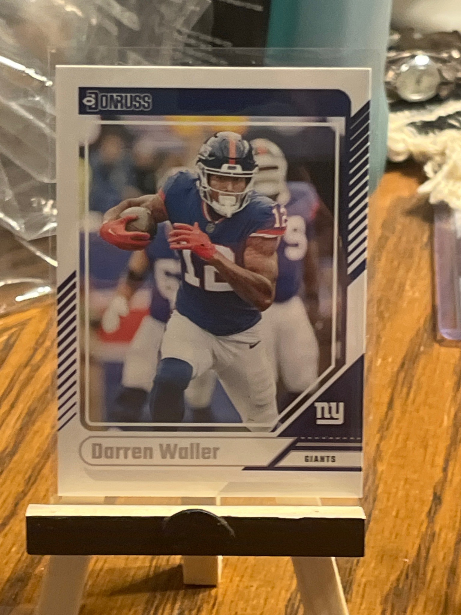 This is a standard 2.5" by 3.5" modern sports trading card from the 2023 Donruss Football set, featuring tight end Darren Waller in a New York Giants uniform. The card showcases a full-action shot of Waller running with the football, framed by the traditional blue and white Donruss design featuring diagonal line accents. The Panini Donruss logo is situated in the top-left corner, while the player's name and the Giants team logo are positioned along the bottom. The card stock appears to be standard thickness with a semi-gloss finish. Based on visual inspection, the card exhibits sharp corners and clean edges, appearing to be in Near Mint to Mint condition. It is currently displayed on a small wooden easel and protected inside a clear plastic penny sleeve and top-loader, which has prevented surface scratches or environmental wear. The centering appears slightly heavy toward the right border. This card represents a typical base-level card from a mainstream modern printing run, utilizing high-quality offset lithography. It serves as a commemorative piece of Waller’s tenure with the Giants following his trade from the Raiders.