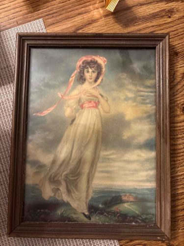 This item is a vintage framed color print of the iconic portrait 'Pinkie,' originally painted by Thomas Lawrence in 1794. The image depicts Sarah Barrett Moulton as a young girl in a flowing white dress with a prominent pink sash and a matching pink bonnet with ribbons trailing in the wind. The background features a dramatic, cloudy sky and a rolling landscape, characteristic of late 18th-century Romanticism. The print is housed in a simple, mid-20th-century wooden frame with a dark brown finish and vertical grooved detailing. The overall construction appears to be machine-made, consistent with mass-produced decor items from the 1940s to 1960s. The condition of the piece shows signs of moderate age, including minor surface scuffs on the wooden frame and potential yellowing or fading of the print due to UV exposure. There is also evidence of dust accumulation beneath the glass, particularly along the bottom edge. While the craftsmanship of the original painting is high, this particular item is a commercial reproduction intended for home decoration rather than a fine arts collector's piece. No visible maker's marks or signatures are evident in the photograph.