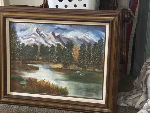 This is an original representational oil painting on canvas, likely dating from the mid-to-late 20th century. The artwork depicts a serene alpine landscape featuring a snow-capped mountain range under a cloudy, expressionistic sky. The mid-ground is dominated by a dense forest of evergreen trees, with smaller deciduous trees in autumnal colors. In the foreground, a calm river or lake reflects the light from the sky, bordered by marshy reeds and tall grasses. The application of paint is thick, showing visible impasto and broad brushwork characteristic of amateur or hobbyist landscape painting from the 1960s-1980s. A small, dark signature is visible in the lower right corner, though it is not clearly legible from this distance. The painting is housed in a substantial tiered wooden frame with a gold-tone inner liner and a cream-colored fillet. The frame shows minor signs of aging, including small scuffs on the wood and faint dust accumulation. Overall, the piece demonstrates a classic 'Bob Ross' style of wet-on-wet naturalism, common for home decor during the latter half of the 20th century.