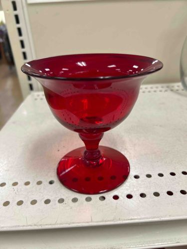 Ruby Red Hand-Blown Flared Compote with Etched Laurel Wreath