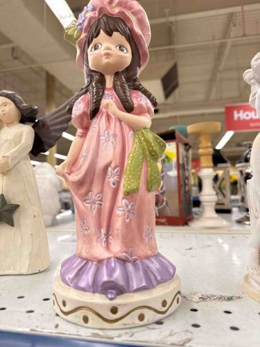 This item is a decorative collectible figurine depicting a young girl in Victorian-style attire, likely dating from the 1970s or 1980s. Constructed from slip-cast ceramic with a matte or bisque-like finish, the figure stands approximately 8 to 10 inches tall. She is depicted wearing an elaborate pink empire-waist gown adorned with lavender floral motifs and a ruffled purple hem. Notable features include a matching pink bonnet with floral accents, long dark brown ringlet curls, and a large green polka-dot sash draped over her arm. The facial features are typical of the 'big-eyed' aesthetic popular in mid-to-late 20th-century giftware, characterized by large, expressive brown eyes and a small, delicate mouth. The figurine sits on a circular white base featuring a gilded wavy line and dot pattern. The craftsmanship exhibits hand-painted details, though some slight irregularities in color application are visible, typical of mass-produced decorative ceramics. Condition appears fair to good; there are visible scuffs on the base and some surface dust accumulation, but no major chips, cracks, or structural repairs are immediately evident in the photograph. There are no maker's marks visible from this angle, though such items were frequently produced by companies like Lefton, Enesco, or as hobbyist ceramic studio pieces.