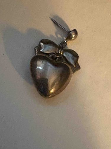 This item is an individual drop-style earring featuring a feminine heart and bow motif. The piece is constructed from a silver-toned metal, likely sterling silver based on the characteristic dark oxidation and patina visible in the recessed areas. The earring consists of three articulated sections: a small spherical post top with a straight mounting pin, a stylized decorative bow middle section, and a large, puffed (hollow-form) heart drop. The heart has a smooth, high-polish finish that shows significant surface wear, including numerous fine hairline scratches and small indentations consistent with regular use. The overall aesthetic suggests a late-20th-century romantic or 'shabby chic' style, possibly from the 1980s or 1990s. While no hallmarks are immediately visible on the front, the jump rings connecting the segments appear sturdy. The metal exhibits a yellow-grey tarnish, indicating a need for professional cleaning to restore its original luster. Its construction utilizes lightweight metal smithing techniques typical of commercial jewelry production of the era.
