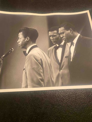 This is a vintage black and white gelatin silver print photograph capturing three members of the legendary gospel group, the Soul Stirrers, performing during the mid-1960s. The image features group members Johnnie Taylor (front left), James Phelps (center), and Paul Foster (right). The subjects are depicted in profile and three-quarter views, dressed in coordinated formal performance attire including light-colored tuxedos with dark shawl lapels and bowties. The lighting is dramatic, highlighting the contours of their faces as they sing into a vintage-style microphone stand visible on the left edge. The photograph appears to be printed on medium-weight glossy paper with a small white border. In terms of condition, there is several visible creases and 'buckling' in the paper across the top edge, and a minor surface scratch is visible on the jacket of the lead figure. The tonality shows a good range of grays with deep blacks, though there is some slight silvering or fading consistent with age. This is a significant piece of music history documenting the mid-century transition from traditional gospel to the soul era. No specific photographer's mark or studio stamp is visible on the front, but the composition suggests a professional candid shot from a concert or recording session.