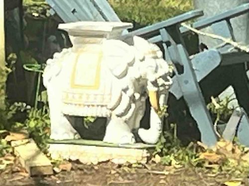 This is a decorative ceramic garden stool fashioned in the form of a ceremonial elephant. The piece is primarily white with subtle yellow or gold accenting on the saddle (howdah) area and tusks. It features a standing elephant with its trunk curled inward, supporting a flat rectangular surface on its back intended for use as a side table or plant stand. The construction appears to be glazed earthenware or porcelain, typical of Chinoiserie garden ornaments. Detailed sculptural elements include draped floral or geometric trappings along the sides, ruffled ear details, and a molded base that mimics a pedestaled platform. The craftsmanship shows mid-range quality with some visible relief work. Regarding condition, the glaze appears somewhat weathered from outdoor exposure, and there is visible dirt or organic staining around the base and lower extremities. Small chips or crazing may be present upon closer inspection given its outdoor placement. Style-wise, it reflects a 20th-century Hollywood Regency or traditional Asian-inspired aesthetic, commonly produced from the 1960s through the modern era. No maker's marks are visible in the photograph, but such items were frequently imported from Asia.