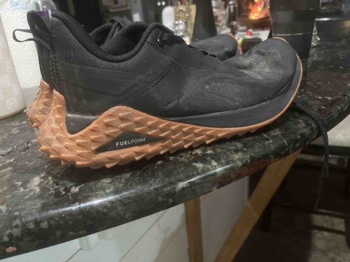 This is a pair of modern athletic training shoes, specifically identifying as the Reebok Nanoflex TR model. The shoes feature a low-top silhouette with a primary upper constructed from a durable, lightweight black mesh fabric and synthetic overlays for structural support. A distinguishing feature is the 'FuelFoam' cushioning technology, which is clearly labeled on a black triangular insert within the lateral side of the midsole. The most striking visual element is the rugged, gum-colored rubber outsole that wraps slightly up the sides of the heel and midfoot, featuring a deep, diamond-patterned lug design for multi-surface traction. The construction includes a traditional lace-up closure with black laces and a convenient webbing pull-tab at the heel for ease of entry. Regarding condition, the shoes show signs of moderate active use; there is visible white dust or dried mud caught in the crevices of the textured gum soles and scattered across the black synthetic upper. The fabric on the toe box appears slightly creased from wear, and the overall patina suggests they have been used for outdoor or cross-training purposes. Despite the surface debris, the structural integrity of the midsole and the stitching appears sound, indicating a high-performance build designed for varied fitness activities. These shoes likely date from the early 2020s, following Reebok's focus on functional training footwear.