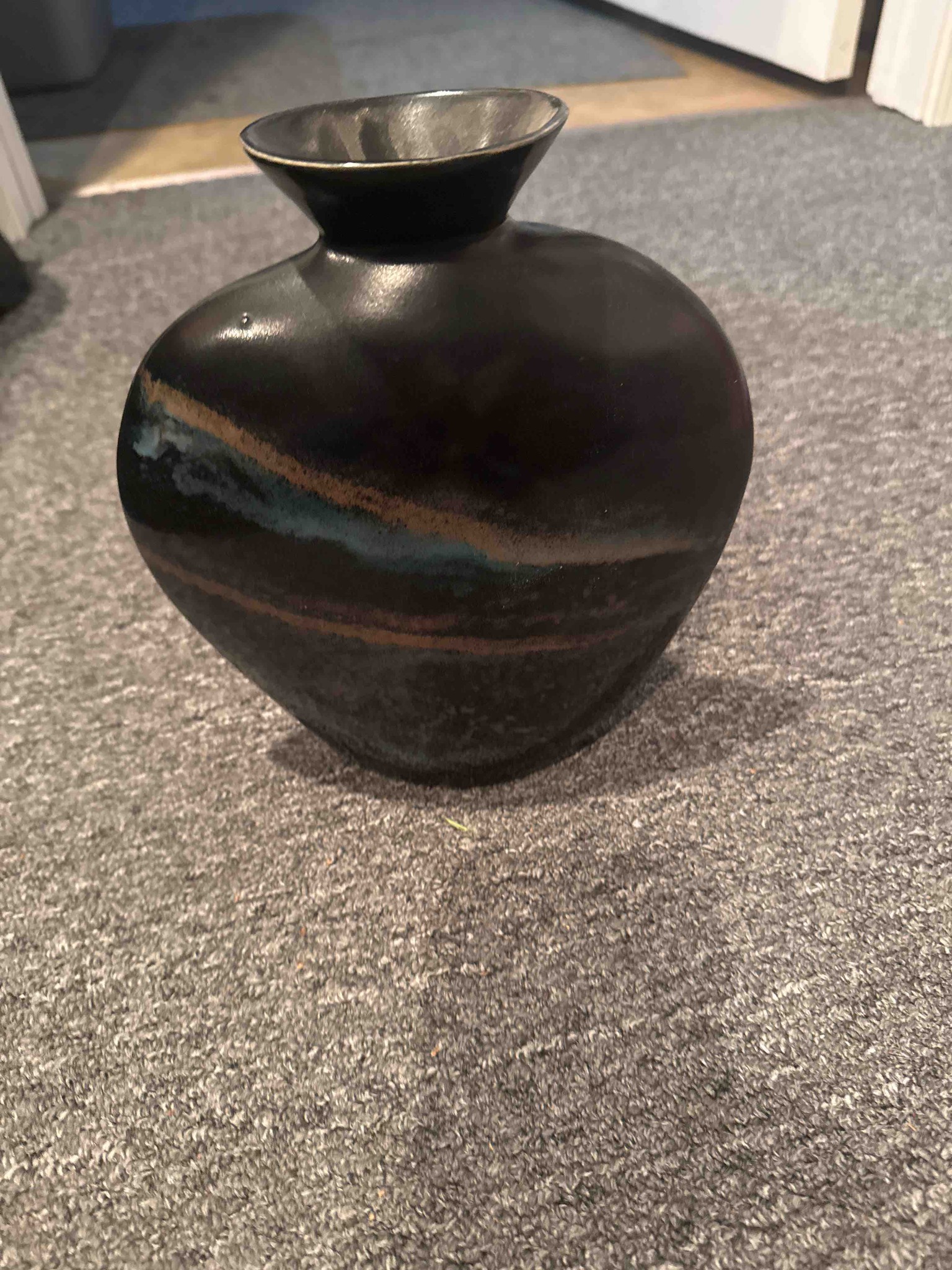 This item is a contemporary studio pottery vase characterized by an ovoid, somewhat flattened heart-like silhouette, often referred to as a 'pillow vase' form. It is constructed from a ceramic stoneware body and finished with a sophisticated multi-tonal glaze. The primary color is a deep, satin-to-matte black charcoal hue, which serves as a canvas for a horizontal band of 'landscape' style glaze transitions. This decorative band features earthy copper-brown tones and a streak of oxidized teal or seafoam blue, suggesting an abstract natural horizon. The vase features a narrow, constricted neck that flares into a wide, shallow, funnel-shaped rim, where the interior glaze appears more metallic or silvery-grey. Its construction shows smooth, professional-grade wheel-thrown or slip-cast qualities with manual refinement. There are visible surface undulations consistent with handmade or artisanal studio work. The condition appears excellent with no visible cracks, chips, or significant crazing, though some light shelf wear may be present on the unglazed base (not visible). The style is indicative of late 20th-century or early 21st-century modern craft, focusing on organic forms and tonal contrast. While no maker's mark is visible in this orientation, the high-quality application of the reactive glaze suggests an experienced ceramicist.