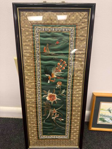 This is a vertical rectangular Chinese silk embroidery panel, likely dating from the mid-20th century. The central scene is hand-stitched on a vibrant emerald green silk satin ground, featuring a symbolic phoenix in flight above a flowering peony branch, with a red sun and stylized clouds in the upper register. The embroidery utilizes a variety of techniques including satin stitch and long-and-short stitch to create texture and depth in the feathers and petals. The colors remain relatively bright, showing shades of orange, coral, white, and gold thread. The central panel is framed by a white and blue wave-pattern border, which is itself mounted on a wide mat of gold-colored brocade fabric with a repeating geometric pattern. The piece is housed in a modern dark-stained wood or faux-wood frame with a thin gold-toned inner lip, protected by glass. The overall construction appears to be for the decorative export market. Condition-wise, the silk ground shows some visible rippling or 'cockling,' which is common for older textiles that have moved against their backing. There are no immediate signs of significant staining or insect damage from this perspective, though some light fading to the thread may be present. The frame is in good condition with minor surface dust.