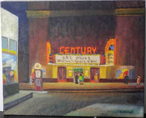 This is an original oil or acrylic painting on canvas measuring 16 x 20 inches, attributed to the artist R. Doerre. The composition depicts a nocturnal urban scene centered on the 'Century' theater, likely the historic Century Theatre in Baltimore. The artwork is executed in a charming folk-art or naive style, characterized by simplified forms and a vibrant, expressive use of color. The palette is dominated by deep browns and blacks of the building facade, contrasted sharply by the glowing oranges and yellows of the neon 'CENTURY' sign and the theater marquee. Small, stylized figures occupy the sidewalk, adding a sense of narrative and life to the urban landscape. A vintage gas pump is visible on the far left, suggesting a mid-20th-century setting. The paint application appears thick with visible brushwork, contributing to a tactile, amateur-yet-earnest quality. The artist's signature, 'R. DOERRE', is clearly visible in the lower right corner. The painting shows some signs of age, including subtle surface texture and minor edge wear consistent with a mid-century work. There are no obvious tears or large-scale repairs visible in the image. The craftsmanship reflects a dedicated hobbyist or regional folk artist, capturing a nostalgic moment in time through a personal, stylistic lens.