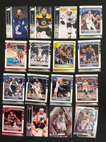 This is a diverse collection consisting of 16 modern sports trading cards, featuring both professional basketball (NBA) and ice hockey (NHL) players. The collection is primarily comprised of 2023-24 Panini NBA Hoops basketball cards, identifiable by their retro-inspired designs with high-gloss finishes and team-specific color borders. Featured athletes include Isaiah Hartenstein, Cam Whitmore, OG Anunoby, and Jaime Jaquez Jr. among others. The hockey cards include Upper Deck 브랜드 releases, featuring players like Auston Matthews in a Toronto Maple Leafs jersey and Linus Ullmark of the Boston Bruins. The set also includes specialty cards like a 2023-24 Panini Prizm Tracy McGrady and a Panini Phoenix Karl Malone. Each card measures approximately 2.5 by 3.5 inches and exhibits modern construction with premium cardstock. The condition appears to be generally excellent to near-mint (EX-MT to NM), with sharp corners and clean edges visible, though the card at the bottom right is the only one shown within a protective top-loader sleeve. No significant creases, surface scratches, or fading are immediately apparent from the photograph. This assortment represents a range of contemporary sets spanning from 'base' cards to some potentially lower-print inserts.