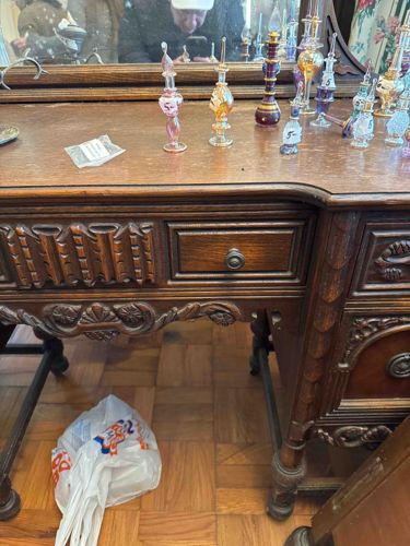 Late Victorian Jacobean Revival Oak Vanity with Glass Perfume Bottle Collection