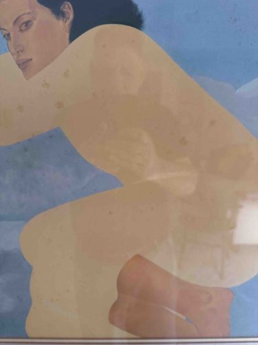 This item is a framed contemporary art print, stylistically consistent with the Yunnan School of painting, specifically exhibiting characteristics often found in the works of Ting Shao Kuang. The central subject is a reclining or hunched female figure, rendered with elongated limbs and an elegant, stylized profile. The color palette is dominated by soft, muted tones of beige and ochre for the flesh, contrasted against a multi-tonal blue background. The figure features delicate facial features with dark, flowing hair. A notable element of the composition is the presence of faint, decorative floral or star-like motifs layered within the skin tones, a hallmark of this artistic style. The piece appears to be a serigraph or high-quality lithograph printed on paper. Regarding condition, there are visible signs of foxing—small, brownish age spots—especially prominent across the lighter-colored areas of the figure and in the upper right background. These spots indicate exposure to humidity or moisture over time. The item is displayed behind glass in a simple, metallic-toned frame. The lack of a visible signature in this cropped view necessitates further inspection of the full margins to confirm specific edition numbers or authenticating marks. Given the aesthetic, it likely dates from the late 1980s to the 1990s.