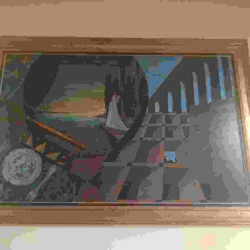 This is an original representational oil painting on canvas by the French contemporary artist Patricia de Boysson. The work depicts a complex, surrealist-influenced scene characterized by a dreamlike architectural landscape featuring a prominent checkered floor that recedes into the background. The composition is divided by a large, dark circular aperture or portal that reveals a figure in white, possibly in a wedding dress or long gown, standing within a structured interior. In the bottom left foreground, a meticulously painted still life includes a decorated plate and utensil atop a floral-patterned surface. To the right, high-contrast architectural columns and windows create a rhythmic, geometric progression. The color palette is varied but leans towards moody grays, deep blacks, and earthy ochres, punctuated by bright blues in the 'sky' portions and vivid reds in the shadows. The brushwork appears deliberate and smooth, typical of de Boysson's clean, narrative style. The piece is housed in a simple, blonde wood frame that secures the canvas. Condition-wise, the painting appears well-preserved with no visible signs of craquelure, paint loss, or sagging. The frame shows minor light-colored scuffs and natural wood grain variations but remains structurally sound. The work captures a sense of mystery and theatricality, hallmark traits of de Boysson's late 20th-century to early 21st-century oeuvre.