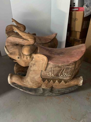 This is a substantial, artisan-carved wooden rocking elephant, depicted in a kneeling or 'howdah' position. The piece is constructed from solid tropical hardwood, likely teak or monkey pod, displaying a natural warm brown grain with reddish undertones on the saddle area. The elephant is intricately detailed with a traditional decorative saddlecloth and headpiece featuring incised geometric and scrolling 'U' patterns. Its anatomy includes expressive carved eyes and large flared ears. The trunk is raised upward in a gesture traditionally symbolizing luck and prosperity. The entire figure is integrated into a curved wooden base, allowing it to function as a rocker. Regarding condition, the piece shows significant evidence of age and use, including dry-cracking or checking in the wood across the flanks and back, paint loss on the ivory-colored accents (tusks and feet), and visible scuffing along the rocker base. There is a notable dark patina in the recessed carved areas, emphasizing the relief work. Based on the carving style and wood type, this is likely a mid-20th-century decorative export from Southeast Asia (possibly Thailand or Indonesia). The craftsmanship is heavy and rustic rather than refined, suggesting a hand-hewn origin.