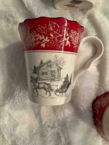 This is a festive ceramic mug featuring a flared, scalloped rim and a decorative 'C' shaped handle with an ergonomic wavy grip. The exterior design follows a holiday or 'winter whimsy' theme. The top portion of the mug is finished in a deep cranberry red glaze with a white transferware-style botanical band featuring pinecones, berries, and evergreen sprigs. Below a red pinstripe dividing line, the cream-colored base displays a classic black line-drawing scene depicting a rustic log cabin in a snowy landscape with a horse-drawn sleigh carrying a pine tree. The interior and handle are finished in a creamy white glaze. The construction is heavy stoneware, characteristic of mass-produced contemporary kitchenware. The condition appears excellent with no visible chips, cracks, or crazing, maintaining a high-gloss finish throughout. The overall style is modern farmhouse or cottagecore, typical of the early 21st-century holiday collections often sold through retailers like QVC.